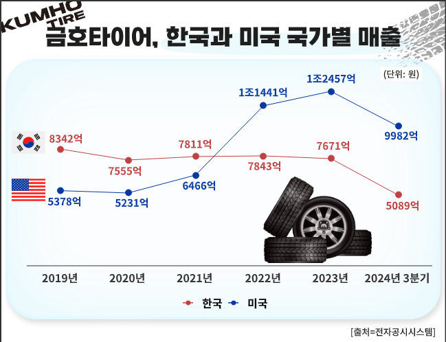 실제 금호타이어의 국가별 매출을 살펴보면 국내 시장에선 최근 3년 간 7000억원대 매출을 유지하고 있는 반면 미국 시장에선 큰 폭의 성장세를 보이고 있다. 2021년 6466억원이던 금호타이어의 북미시장 매출은 2022년 1조1441억원, 2023년 1조2457억원 등으로 매년 가파르게 상승했다.