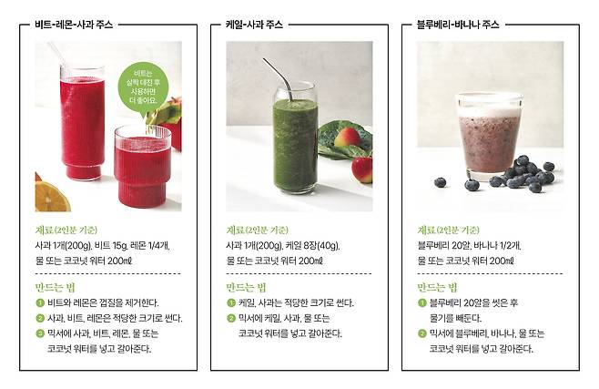 사과 1개(200g), 비트 15g, 레몬 1/4개, 물 또는 코코넛 워터 200㎖