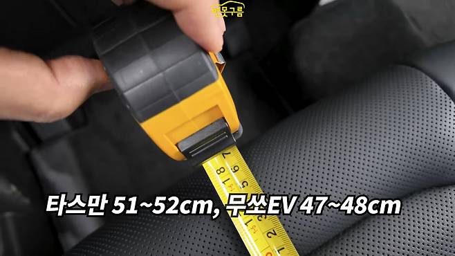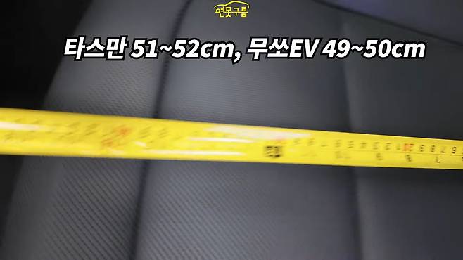 무쏘 EV의 2열 좌판 사이즈는 47-48cm로 측정되어 장거리 이동 시에도 편안함을 제공할 것으로 예상된다. 헤드룸 공간 또한 넉넉하여 176cm 남성이 주먹을 두 개 정도 넣을 수 있을 정도로 여유가 있다. 발밑 공간도 최소 12cm로 나타나 전반적으로 편안한 실내 공간을 확보했다.