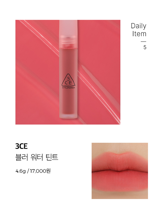바를 땐 촉촉하게, 밀착된 후엔 보송하게 마무리되는 틴트. 매트하게 마무리되면서도 수채화처럼 맑게 발색되어 여리한 분위기를 표현할 수 있어요. 입술에 가볍게 스며드는 제형으로 한 번 바르면 퇴근할 때까지도 바른 컬러 그대로 남아있어서 수정 화장시 자주 찾게 되는 제품.