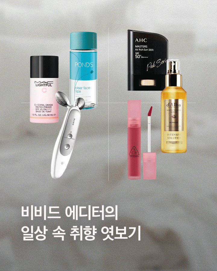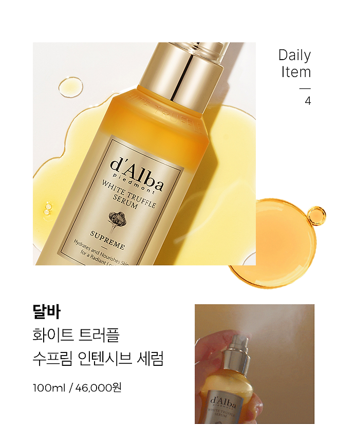 달바의 화이트 트러플 수프림 인텐시브 세럼은 건조한 실내에서 즉각적인 보습이 가능한 제품인데요. 일반 수분 미스트보다 수분감이 오래 유지되어서 촬영장에 꼭 챙기는 아이템이에요. 메이크업한 얼굴에 뿌려주면 윤광이 더해져서 시간이 지나도 피부가 예쁘게 유지돼요. 촬영 중 모델 얼굴에 물광을 표현해 줄때도 꼭 사용해 주고 있어요.