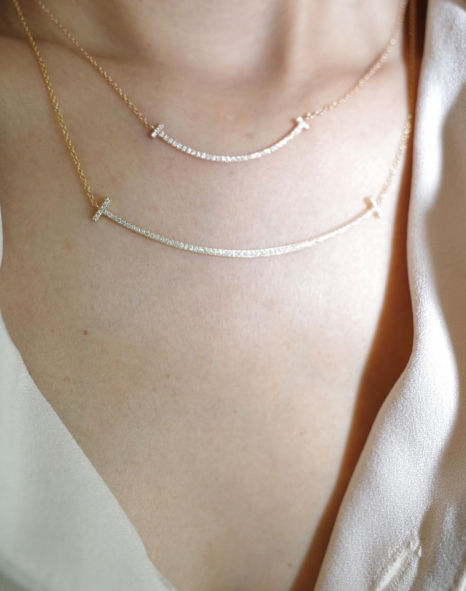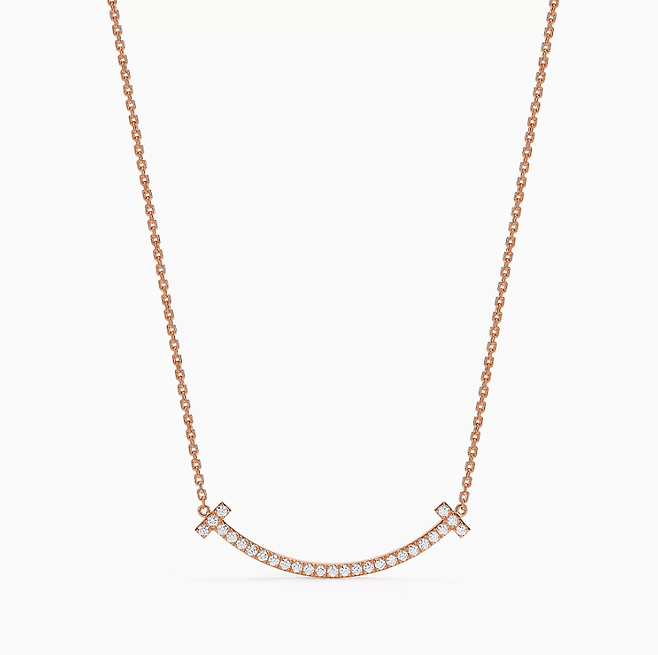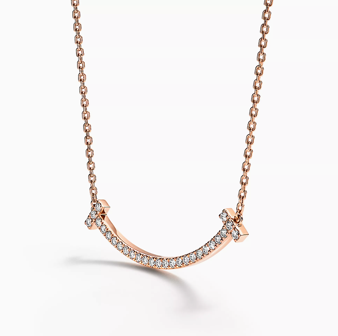 김나영님이 선택한 목걸이는 티파니 T 목걸이로, 미디엄 스마일 펜던트가 로즈 골드 소재에 다이아몬드가 세팅되어 있습니다.