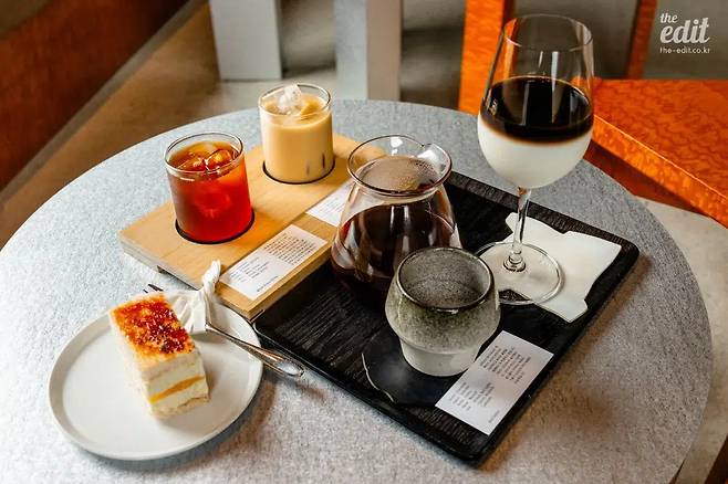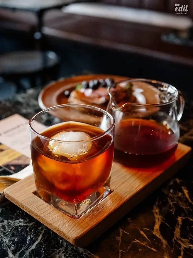 추천 메뉴는 싱글오리진 브루잉커피와 블루베리 패스트리. 얼그레이 차와 복숭아, 레몬그라스를 연상시키는 에티오피아 싱글오리진이 입안에서 절묘하게 혼합된다. 이외에도 저녁시간 라운지 전용 메뉴로 콜드 브루 마티니 칵테일도 마셔볼 것을 강력하게 추천한다.