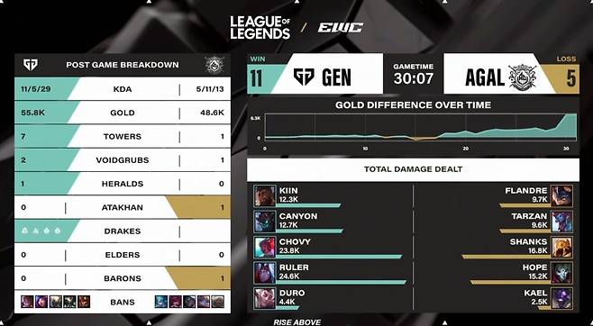 AL은 바론 버프를 믿고 미드 1차 타워를 강하게 압박했는데, 젠지가 후방에 순간 이동을 활용해 한타를 승리하면서 그대로 미드로 향해 넥서스까지 파괴하며 승리했다.