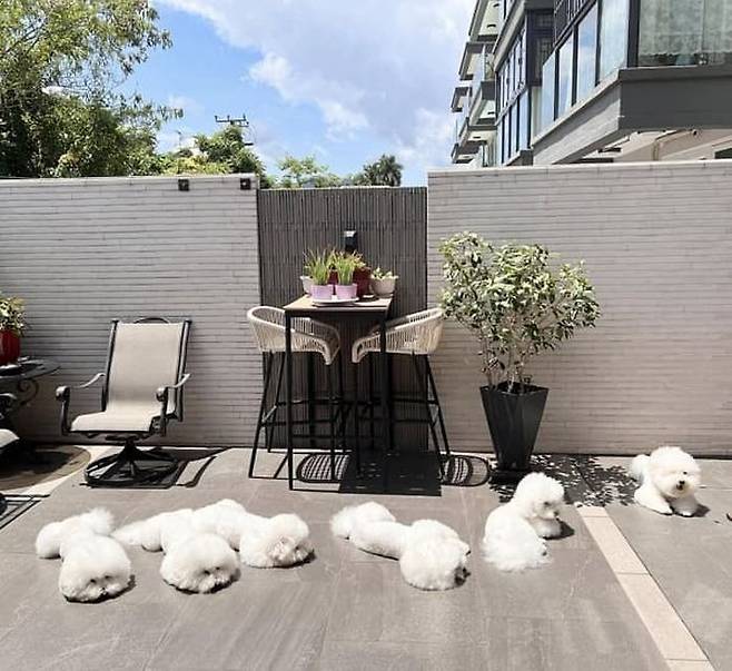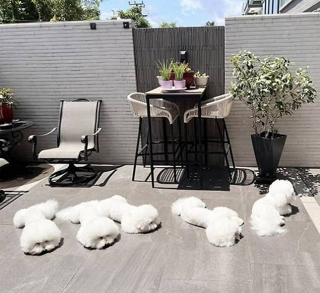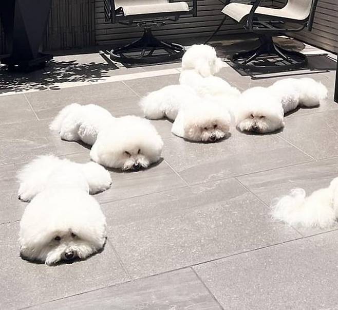 공개된 사진 속에는 각자 자리를 하나씩 차지해서는 정원 바닥에 엎드려 일어날 생각을 하지 않는 비숑 프리제 강아지들의 모습이 담겨 있었죠.
