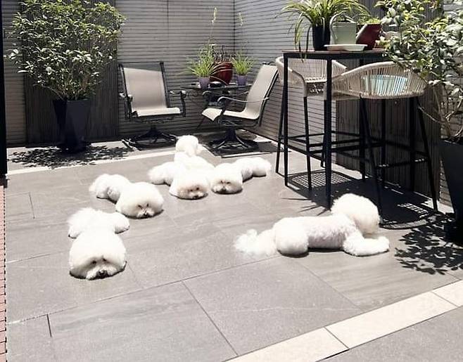 공개된 사진 속에는 각자 자리를 하나씩 차지해서는 정원 바닥에 엎드려 일어날 생각을 하지 않는 비숑 프리제 강아지들의 모습이 담겨 있었죠.