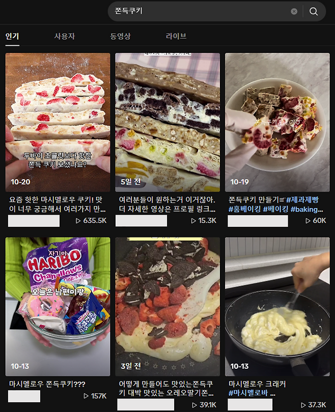 이미지 = 틱톡 ‘쫀득쿠키’ 검색 화면 캡처 (https://www.tiktok.com/search?q=쫀득쿠키&t=1730243746354)