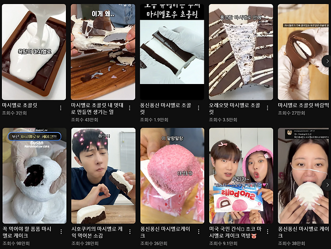 이미지 = 유튜브 ‘마시멜로 초콜릿 / 마시멜로 케이크’ 검색 쇼츠 화면 캡처 ([https://www.youtube.com/results?search_query=마시멜로+초콜릿](https://www.youtube.com/results?search_query=%EB%A7%88%EC%8B%9C%EB%A9%9C%EB%A1%9C+%EC%B4%88%EC%BD%9C%EB%A6%BF), [https://www.youtube.com/results?search_query=마시멜로+케이크](https://www.youtube.com/results?search_query=%EB%A7%88%EC%8B%9C%EB%A9%9C%EB%A1%9C+%EC%BC%80%EC%9D%B4%ED%81%AC))