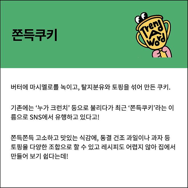 그러다 지난 8월 말, ‘달라또’라는 디저트 매장에서 이 디저트에 ‘쫀득쿠키’라고 이름을 붙여 판매한 것이 인기를 얻어 인스타그램에서 아주 핫해졌다고! 덕분에 9월과 10월 쫀득쿠키 검색량이 급증했다.