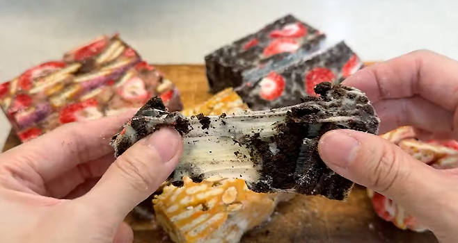 원하는 두께로 눌러서 냉장고에 굳혀주면 완성! 먹기 좋게 잘라 먹으면 된다고 한다.
