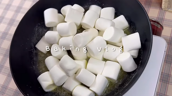 먼저 버터를 가볍게 녹인 후, 마시멜로를 넣어 버터를 골고루 묻혀주고 전자레인지에 돌려준다.