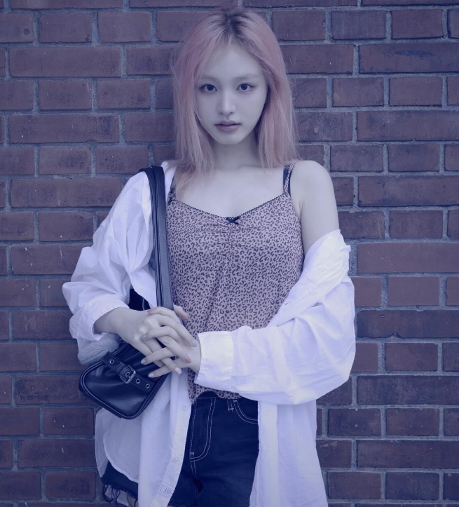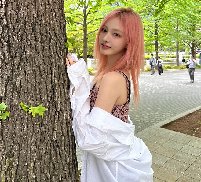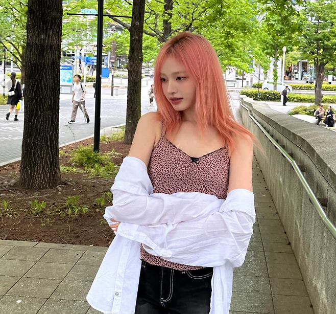 헤어는 핑크빛으로 물들여져, 서구적인 느낌을 뽐내는 동시에 개성 넘치는 매력을 강조했어요. 핑크빛 컬러는 부드럽고 여성스러운 느낌을 주면서도, 리즈 님의 스타일에 독특하고 과감한 요소를 추가했죠.