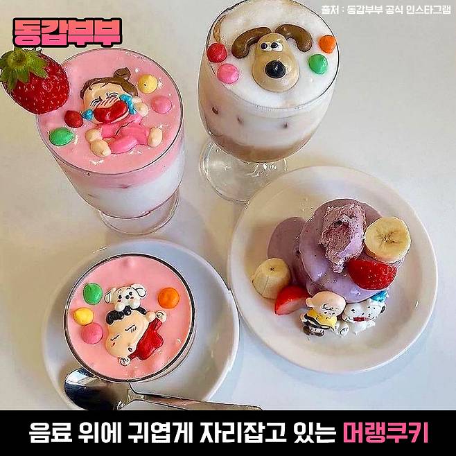 이번에도 광안리 카페입니다. 광안리가 너무 가고 싶어지는데요? 이름답게 동갑내기 젊은 부부가 운영하는 곳입니다. 이곳이 특별한 이유는 커피 위에 캐릭터 머랭쿠키가 올라가기 때문이에요! 캐릭터 머랭들을 사진에서 고를 수 있고 1,000원의 추가금이 든다고 합니다~