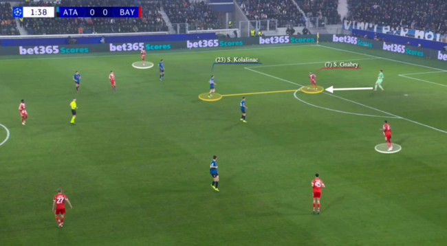 당시 바이에른은 경기장 전역에서 맨투맨 수비를 펼친 아탈란타를 만났다. 콤파니 감독은 세르주 그나브리를 공격형 미드필더 자리에서 센터백 위치까지 내려오게 했다. 아탈란타 수비수는 그나브리를 따라 내려갔다. 그 순간 그나브리 뒤 공간이 열렸고, 바이에른 선수들이 그 틈을 파고들었다.