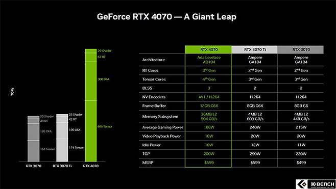 지포스 RTX 4070의 가격은 599달러다. MSRP 기준 가격으로, RTX 3070 Ti의 출고가와 동일하게 매칭됐다.