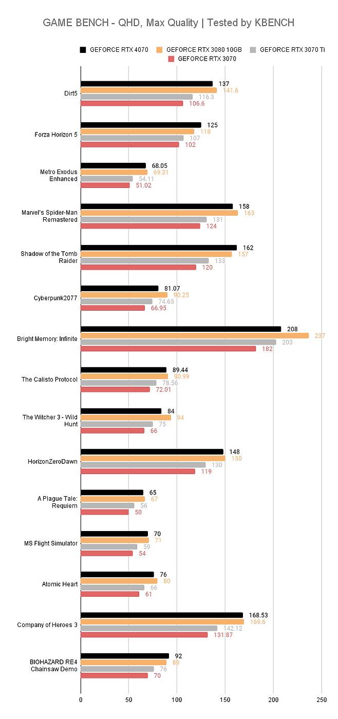 나머지 비교는 예상대로다. RTX 3070 Ti나 3070은 지포스 RTX 4070 보다 한 세대 이전 모델이라는 것이 더 명확해졌다.
