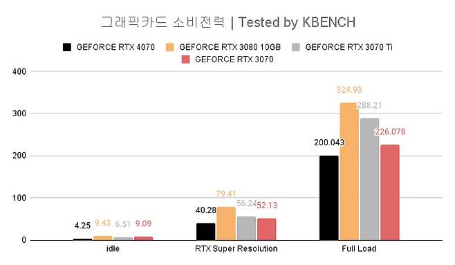 거기다 최근 추가된 동영상 업스케일링 기술인 RTX 슈퍼 레졸루션도 같은 4단계 조건에서 제품 별 소비전력 차이가 컸다. 지포스 RTX 4070이 40W대로 가장 낮았고 RTX 30 시리즈는 GPU 성능에 따라 52에서 최대 79W까지 높아졌다.