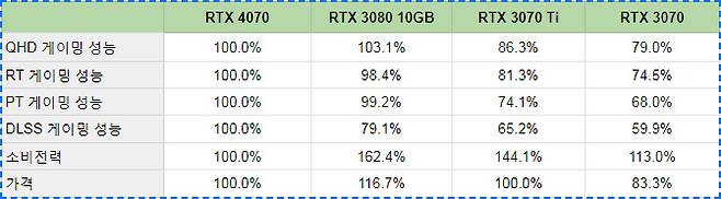 이전 세대 모델인 RTX 3070과 비교하면 성능 차이가 꽤 크다. 단순 세대 교체로는 충분히 매력적인 성능이다.
