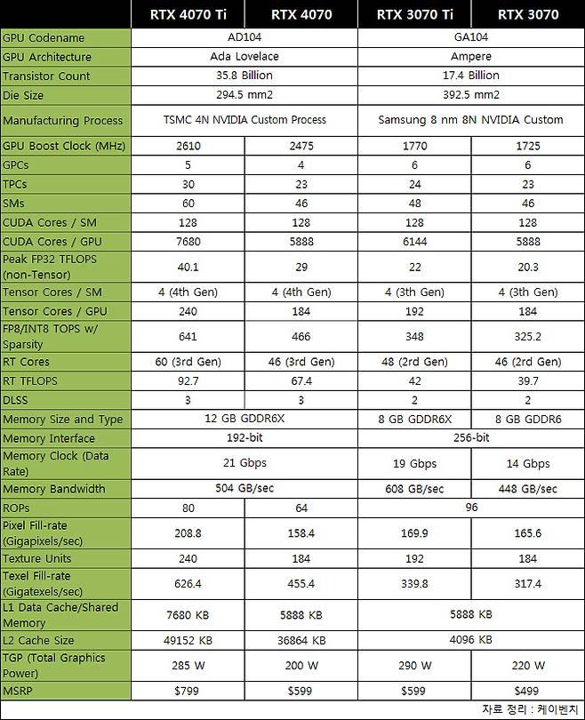 실제, 모델별 세부 사양을 비교해 봐도 지포스 RTX 4070에 사용된 AD104 GPU는 이전 세대 보다 발전된 4세대 텐서 코어와 3세대 RT 코어를 탑재했고 각각의 계산 능력 또한 이전 세대를 뛰어 넘었으니 비싼 만큼 가치가 있는 건 분명한 사실이다.