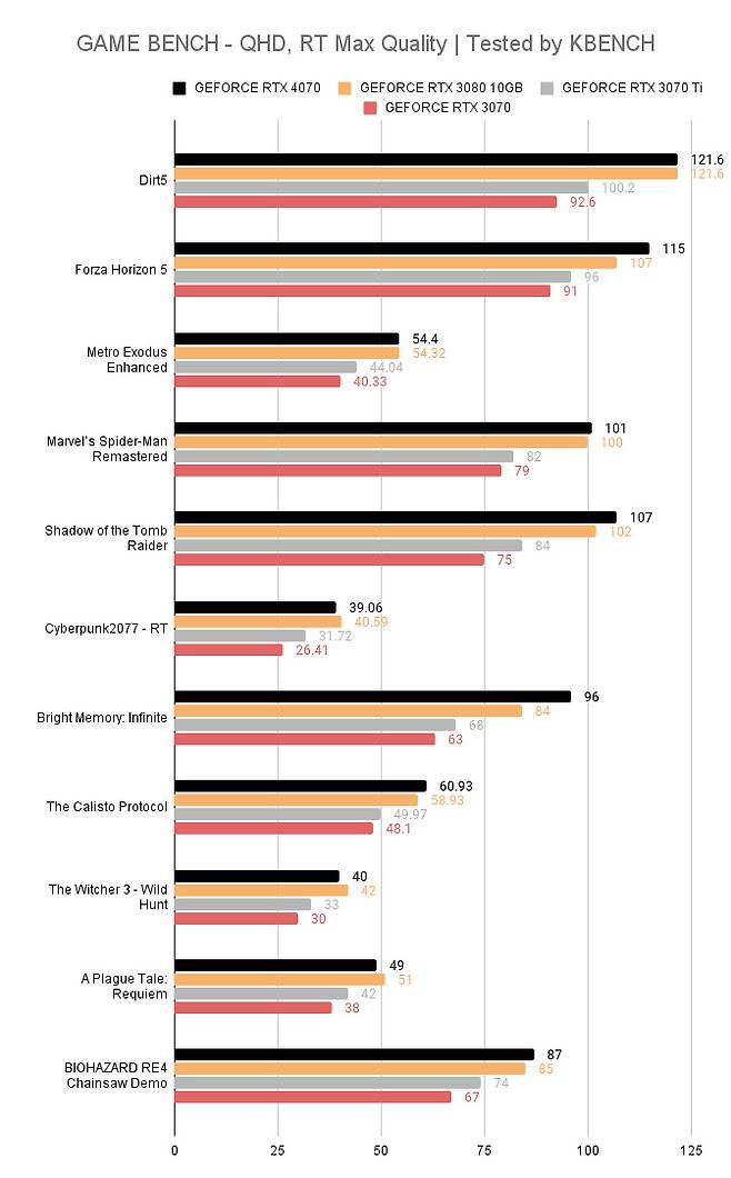 나머지 비교는 예상대로다. RTX 3070 Ti나 3070은 지포스 RTX 4070 보다 한 세대 이전 모델이라는 것이 더 명확해졌다.