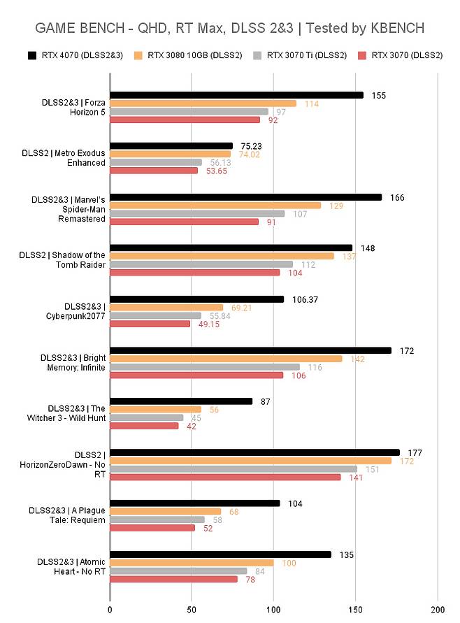 AI 프레임 생성 기술이 더해진 DLSS3를 지원하기 때문인데 차트를 보면 알겠지만 DLSS3 지원 게임에선 RTX 3080을 압도하는 프레임을 보여준다. RTX 3070과 비교하면 2배 이상인 게임도 있을 정도다.