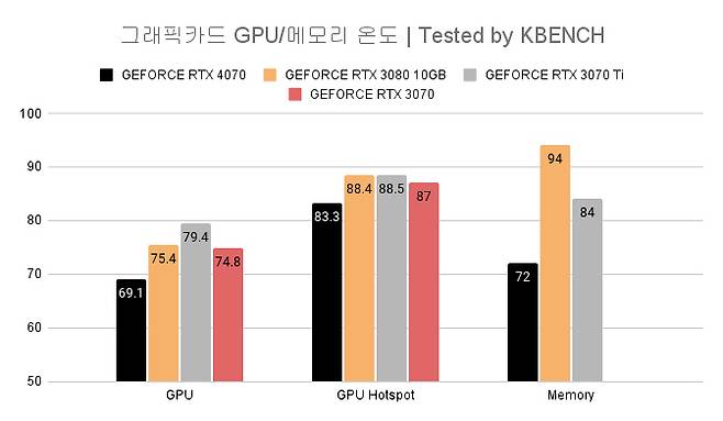 지포스 RTX 4070의 TGP는 200W다. 동급 성능을 제공하는 RTX 3080이 320W인 것과 비교하면 무려 100W나 낮다. 하지만, RTX 3080의 쿨링 솔루션은 RTX 4070 보다 한 체급 이상이니 GPU나 메모리 온도 만큼은 예상과 다른 결과가 나타날 수도 있었는데 확인 결과 이변은 없는 것으로 나타났다.