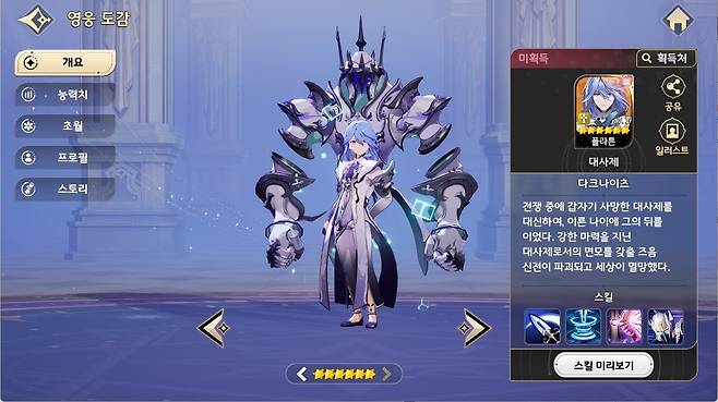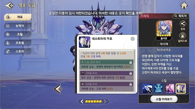 기본 공격은 적중 시 100% 확률로 2턴 동안 지속되는 모든 공격력 감소(7%) 디버프를 제공한다. '심판대행'은 2회 피해의 전체 공격기로, 피해량의 32%만큼 자신의 체력을 회복할 수 있다. 마지막으로 '이계의 빛'은 2인을 대상으로 하는 스킬이며, 버프가 많은 순으로 선택되어 생명력 전환(32%) 효과를 지닌다. 전체적인 구성이 방덱(방어 덱)에 어울리는 형태로 출시된 만큼, 방덱 메타에 변화가 있을 것으로 예상된다.