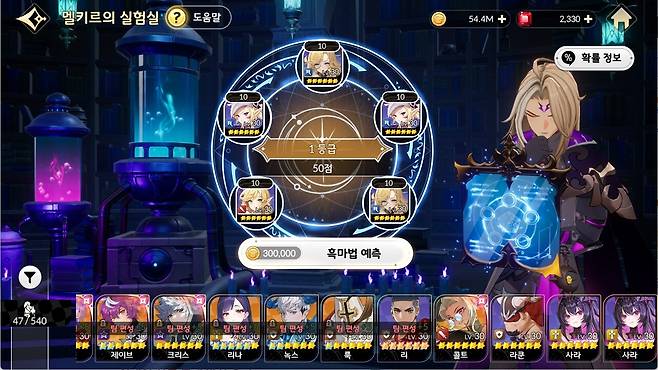 '멜키르의 실험실'은 6성 영웅과 레아를 재료로 사용해 새로운 영웅을 획득할 수 있는 콘텐츠다. '멜키르의 실험실'은 모험 5-30(악몽) 클리어 후 해금된다. 5명의 영웅을 재료로 사용할 수 있으며, 사용된 영웅에 따라 획득하는 점수에 차이가 있다. 점수 구간은 50~1,000점까지 나뉘며, 6등급(최소 381점)부터는 획득 목록에 (구)사황이 포함된다.