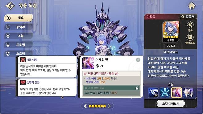 신규 영웅 플라튼 등장첫 지원형 스페셜 영웅, 버프 해제와 생명력 전환 보유 8월 7일(목) 적용된 세븐나이츠 리버스 업데이트로 '플라튼'이 합류했다. 플라튼은 다크나이츠 소속 세 번째 영웅으로, 전설 등급의 지원형 영웅이다. 단순 지원을 넘어 마법 공격력과 방어력에 비례한 피해를 입히는 스킬도 탑재했다.