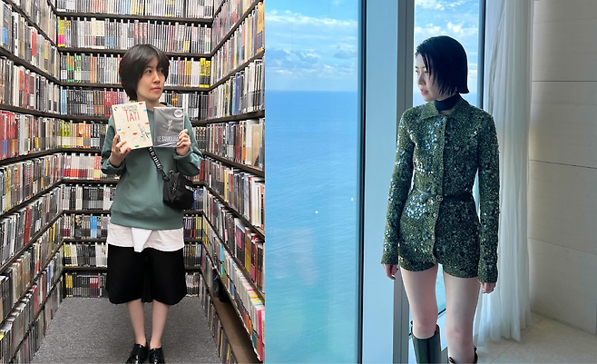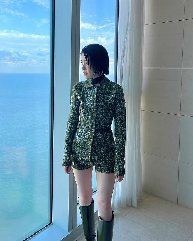 전망 좋은 창가에서 심은경은 올리브 컬러의 시퀸 점프수트로 화려하면서도 절제된 무드를 선보인다. 슬림한 실루엣과 벨트 디테일이 허리를 강조하며, 무릎까지 오는 블랙 부츠로 도시적인 분위기를 더했다. 젖은 듯한 짧은 헤어스타일이 세련된 이미지를 완성한다.
