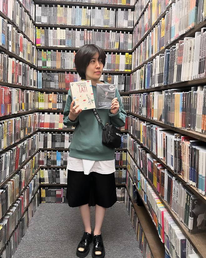 심은경은 벽면 가득 DVD가 진열된 공간에서 그린 맨투맨과 블랙 버뮤다 팬츠, 화이트 티셔츠 레이어드로 편안한 캐주얼룩을 연출하고 있다. 블랙 더비 슈즈와 크로스백으로 실용성을 더했으며, 자연스러운 헤어스타일과 미니멀한 액세서리가 전체적인 분위기를 한층 자유롭게 만든다.
