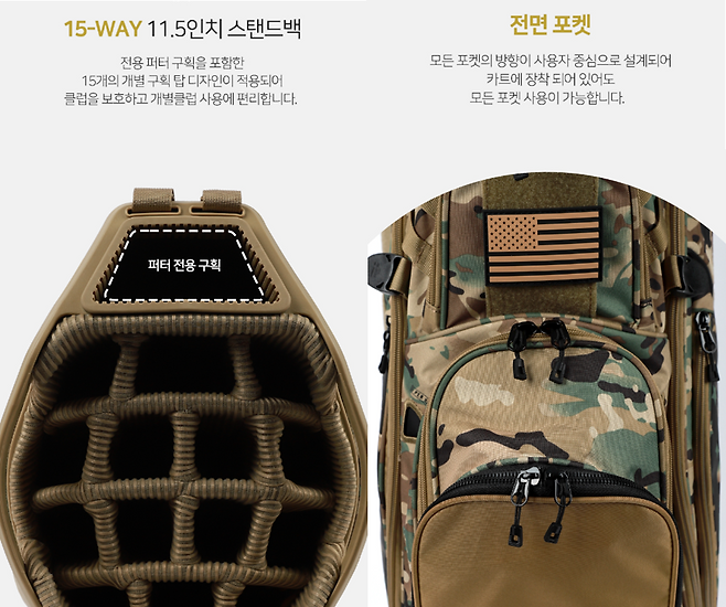 오늘 리뷰할 모델은 아주 튼튼하고 야무지게 생긴 C130s 카모 스탠드 백입니다. 요즘 메인으로 사용하고 있는데 효율성, 디자인, 감성 모두 충족시켜주는 멋진 아이템이네요. 특히, 15-way 구조라서 저처럼 골프채들을 정리하기 좋아하는 골퍼에게 딱입니다.