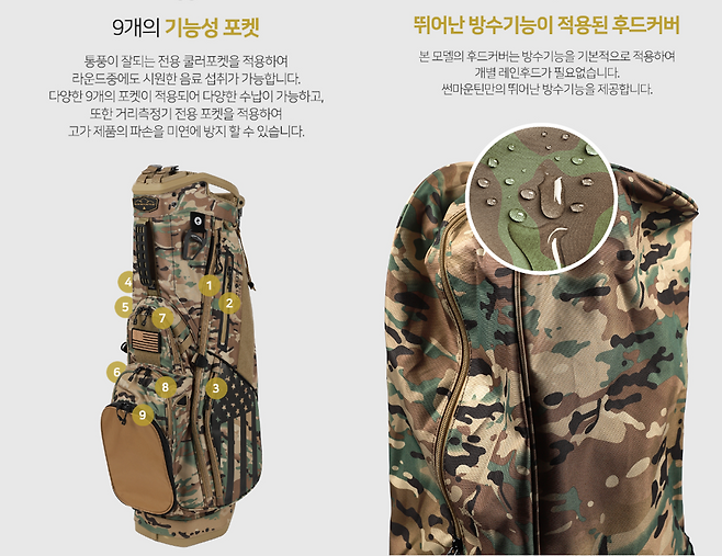- 가방 전체는 방수 소재로 제작되었으며, 실용적인 큼직한 포켓/주머니가 9개로 아주 만족스럽습니다. 특이하게도, 가방의 양면이 동일하게 제작되어 있어서 어느 면에서도 멋지고 포켓도 똑같은 위치에 있네요. 특히, 방수 지퍼가 달린 귀중품 주머니도 두 개입니다. 지퍼마다 쉽게 사용할 수 있도록 스트랩이 별도로 장착되어 있고, 어깨 끈은 캐디백 같은 큼직한 싱글 스트랩에 가벼운 레인 후드 포함.