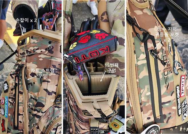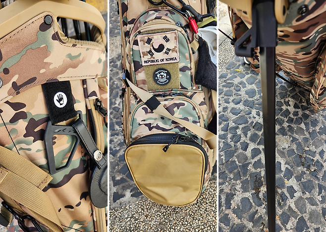 - 저에게 스탠드 백은 수납 포켓이 많아야 하지만 실용적이어야 합니다. 총 9개 큼직한 포켓이 있는데 많은 물건을 가지고 다니기 좋아하는 저는 하나같이 모두 요긴하게 사용하고 있습니다. 포켓마다 개성이 있으며, 쿨러 포켓, 귀중품 포켓, 방수 포켓, 대형 사이드 포켓이 모두 양옆에 똑같이 있고, 정면에는 3개의 큼직한 포켓으로 많은 골프공과 티, 그리고 레인지 파인더를 수납할 부드러운 라이닝의 주머니가 있습니다. 또한, 가장 정면 포켓 앞면은 지퍼를 완전히 탈착해서 원하는 로고나 이름을 자수해 넣을 수 있습니다. 어떤 로고로 장식할지 고민 중이네요.^^