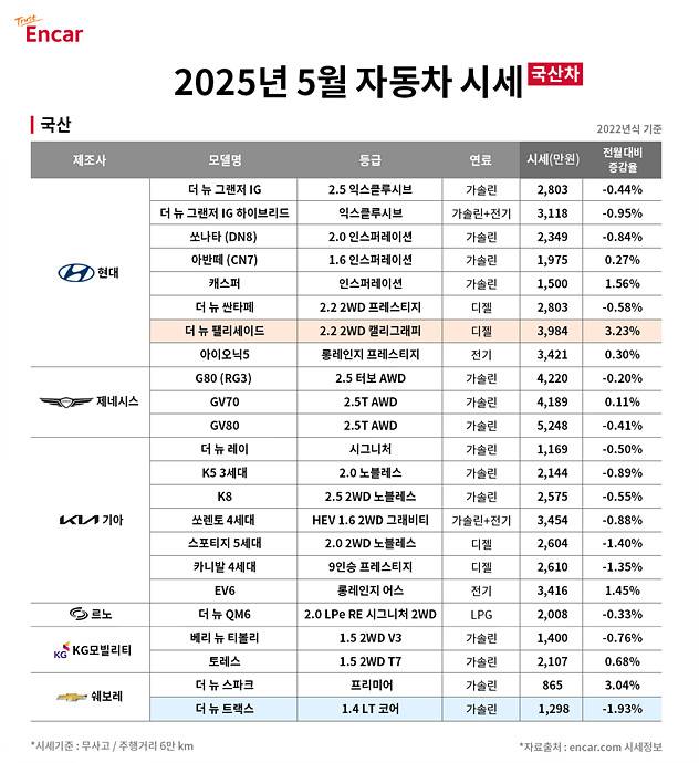 엔카닷컴(대표 김상범)이 2025년 5월 중고차 시세를 발표했다. 이번 시세는 엔카닷컴의 빅데이터를 기반으로, 현대차·기아·르노코리아·KG모빌리티 등 주요 국산차 브랜드와 벤츠·BMW·아우디 등 수입차 브랜드의 2022년식 인기 모델을 대상으로 주행거리 6만km, 무사고 차량을 기준으로 분석한 결과다.