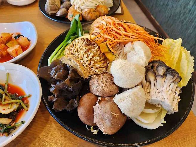 청계산 근처의 경관 좋은 만두전골 맛집 성남 '디안만두전골'. 직접 재배한 상황버섯 달인 물로 육수를 만드는 이 집의 만두전골 육수는 시원하고 감칠맛이 느껴지면서도 건강한 맛이 난다. 동충하초를 비롯해 노루궁뎅이버섯과 느타리버섯 등 직접 재배했다는 여러 가지 버섯과 백합조개, 유부주머니 등 다양한 재료들과 굴림 만두가 나오는데 버섯이 들어가 진국인 국물을 가득 머금은 만두는 부드럽게 넘어가는 식감이 일품이다. 부드러운 굴림 만두는 다양한 식감의 버섯과 함께 알맞게 익은 깍두기와 함께 곁들여 먹으면 조합이 아주 좋다.