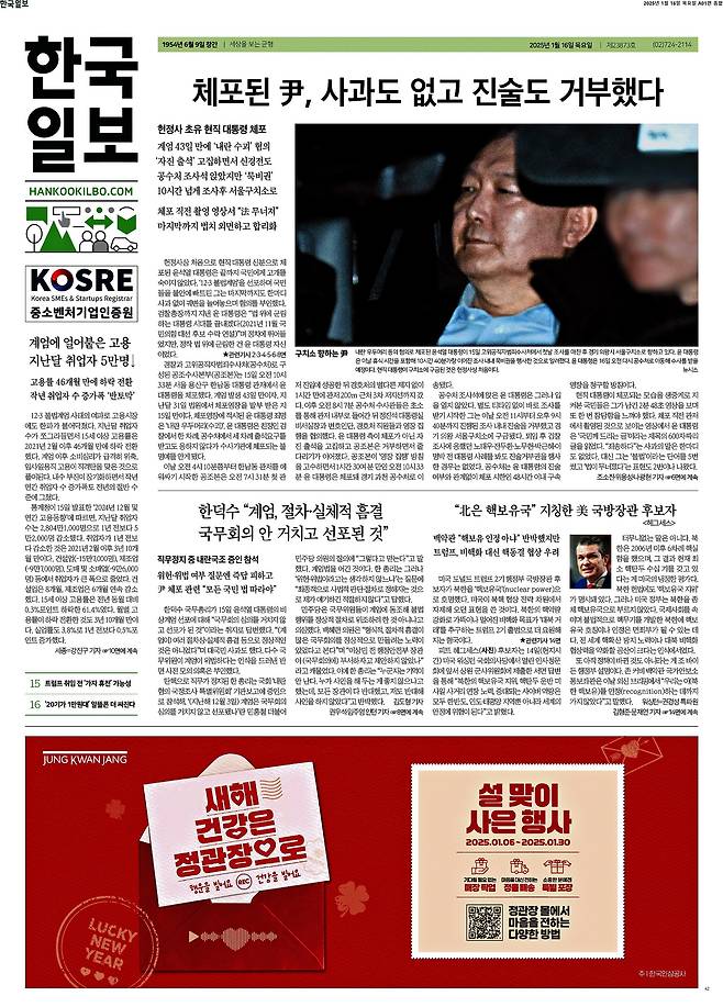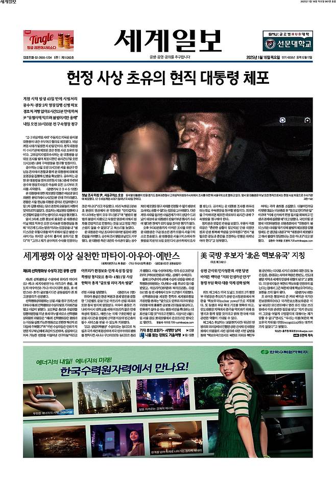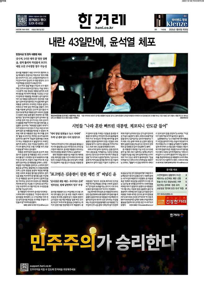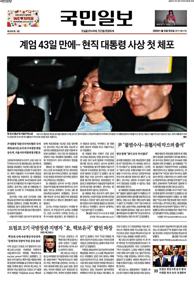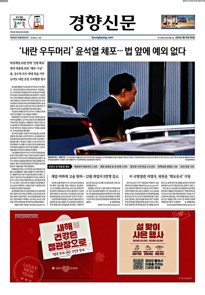 - 경향신문 1면 머리기사 제목은 “내란 우두머리 윤석열 체포… 법 앞에 예외 없다”다.