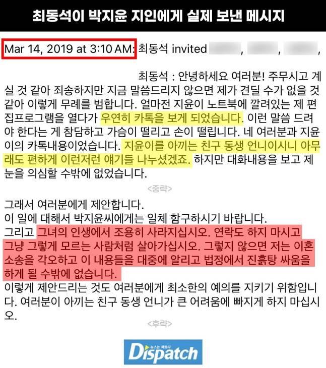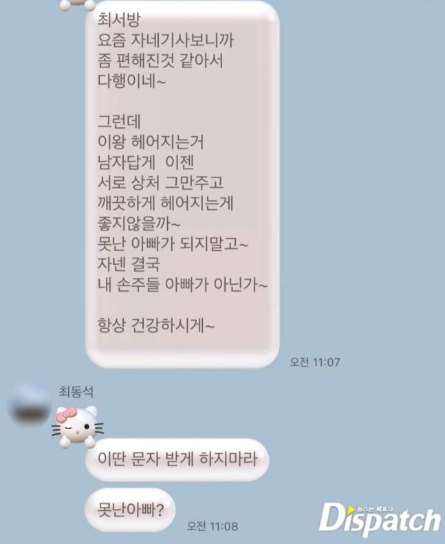 '디스패치'는 그날(5월 7일), 최동석과 장인이 나눈 문자를 통해 전후 사정을 알 수 있었다.