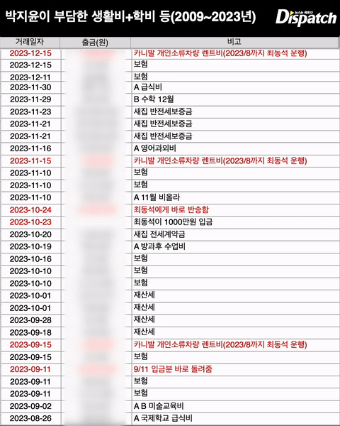그리고 박지윤은 학비, 임대료, 생활비, 공과금, 세금 등 대부분을 감당했다. 가사 도우미 및 통학 기사 비용도 박지윤의 몫이었다.