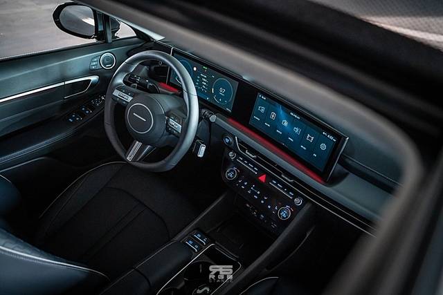 그 외에 사이드의 모습은 그대로이지만, 전체적으로 매끈한 모습을 보여주고 있다. 그리고, 전면부와 후면부의 파격적인 변화 만큼이나 실내의 변화 역시 파격적이다. 쏘나타 디 엣지의 실내 디자인은 와이드한 공간을 잘 연출해주고 있다. 각각 12.3인치의 디지털 클러스터와 인포테인먼트 시스템으로 구성된 파노라믹 커브드 디스플레이를 최초로 탑재해 시인성은 물론, 고급스러움을 높였으며, 전체적으로 모던하면서 하이테크한 디자인이 인상적이다.