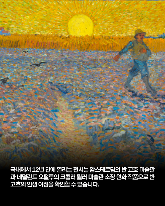 이번 전시는 10년간의 짧은 화가 생활을 살며 반 고흐가 남긴 불후의 명작들을 한자리에 모은 국내 단독 회고전인데요, 국내에서 12년 만에 열리는 이 전시는 암스테르담의 반 고흐 미술관과 네덜란드 오털루의 크뢸러 뮐러 미술관 소장 원화 작품으로 반 고흐의 인생 여정을 확인할 수 있습니다.