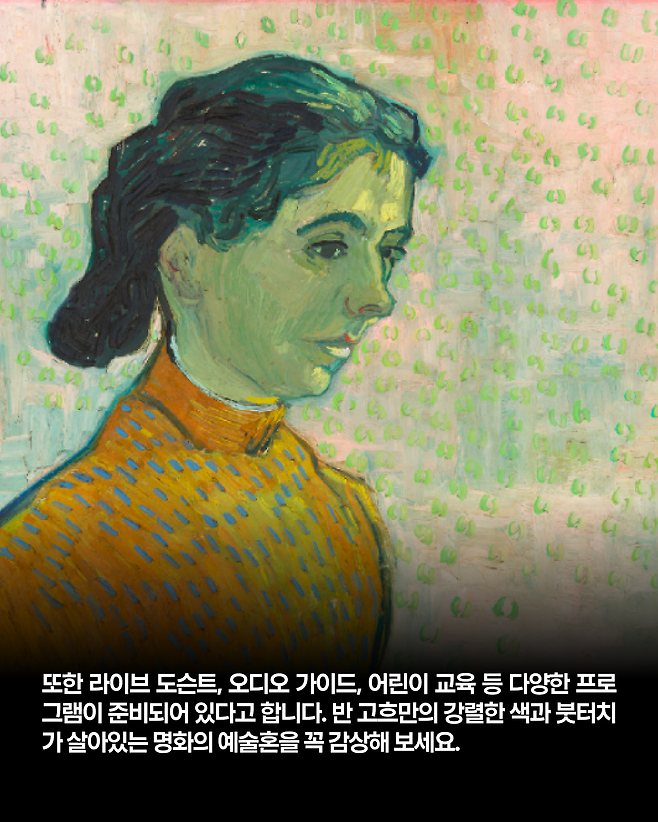 또한 라이브 도슨트, 오디오 가이드, 어린이 교육 등 다양한 프로그램이 준비되어 있다고 합니다. 반 고흐만의 강렬한 색과 붓터치가 살아있는 명화의 예술혼을 꼭 감상해 보세요.
