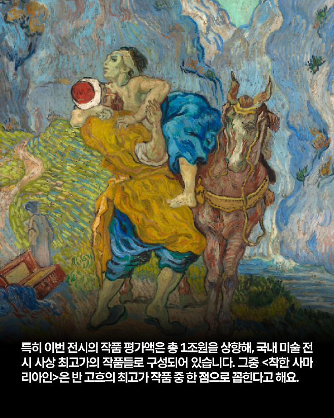 그는 천재 화가였지만 37세의 젊은 나이로 요절하였는데요. 이번 원화들을 통해 안타깝지만 경의로운 그의 삶과 인간적인 고뇌를 엿볼 수 있습니다. 특히 이번 전시의 작품 평가액은 총 1조원을 상향해, 국내 미술 전시 사상 최고가의 작품들로 구성되어 있습니다. 그중 <착한 사마리아인>은 반 고흐의 최고가 작품 중 한 점으로 꼽힌다고 해요.