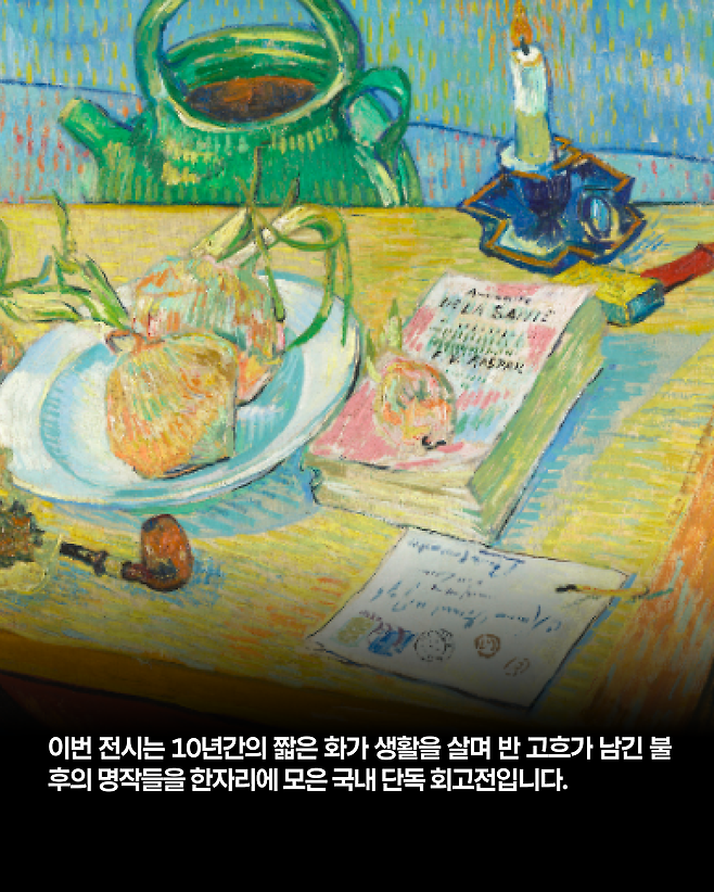 이번 전시는 10년간의 짧은 화가 생활을 살며 반 고흐가 남긴 불후의 명작들을 한자리에 모은 국내 단독 회고전인데요, 국내에서 12년 만에 열리는 이 전시는 암스테르담의 반 고흐 미술관과 네덜란드 오털루의 크뢸러 뮐러 미술관 소장 원화 작품으로 반 고흐의 인생 여정을 확인할 수 있습니다.