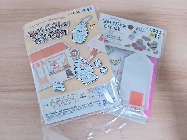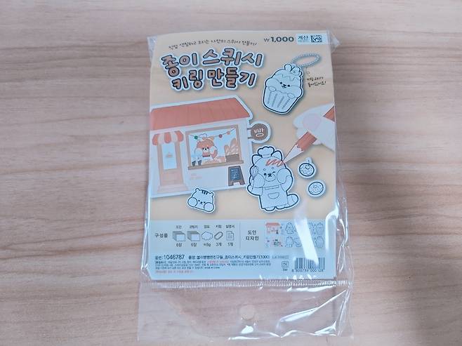 제일 먼저 종이 스퀴시 키링부터 소개해드릴게요. 안에 열어보면 종이 그림 도안과 솜, 투명 시트지, 키링, 설명서 이렇게 들어있답니다.