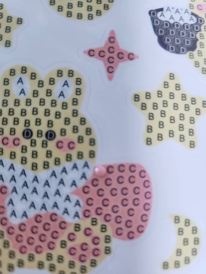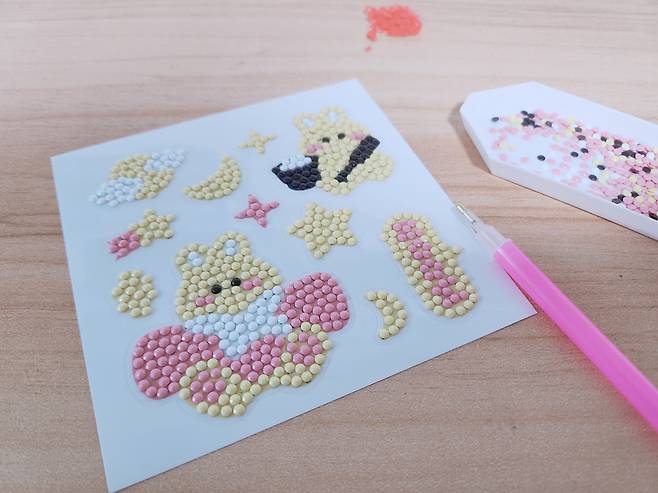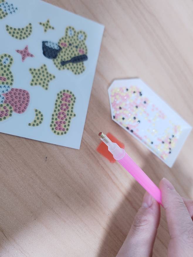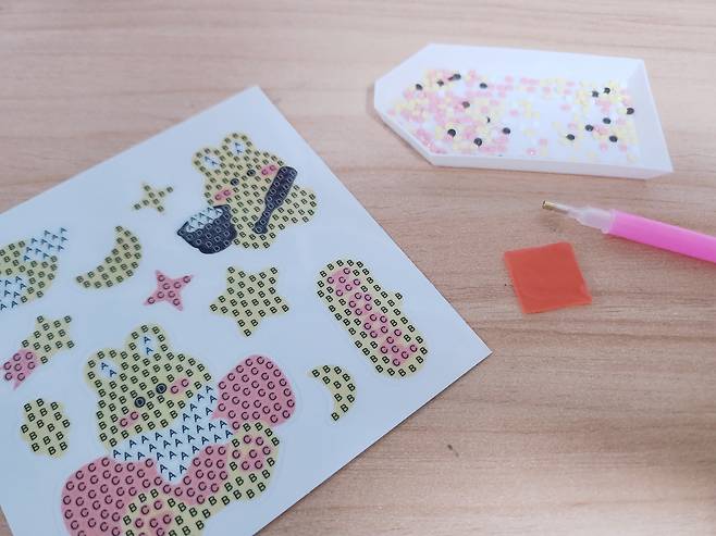 그다음 도안에 적힌 색깔과 동일한 보석비즈를 찾아 콕 콕 찍어 붙여주시면 된답니다.