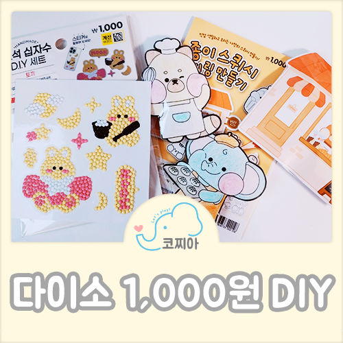 오늘 소개해드릴 놀이는 다이소에서 살 수 있는 1,000원의 행복!! DIY 놀이랍니다. 재료사러 다이소에 갔다가 괜찮은 만들기가 있길래 아이랑 함께 사서 만들어 보았어요~ 가격대비 아이도 정말 좋아하는 아기자기하 만들기였는데, 휴대가 편해서 어디 여행가거나 놀러갈때 하나씩 사서 가도 괜찮겠더라구요. 스마트폰 사용시간을 줄여주고, 재미있게 만들기 할 수 있어서 추천드린답니다!
