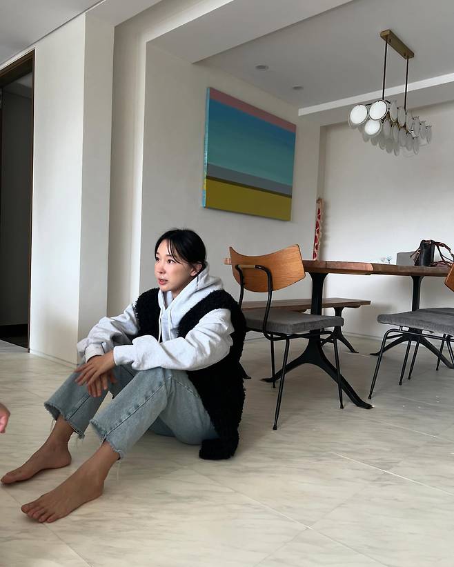 이지혜는 후드티와 데님 팬츠를 활용해 편안하고 자연스러운 캐주얼룩을 선보였다. 여기에 퍼 베스트를 레이어링하여 간결하면서도 스타일리시한 느낌을 더했다. 맨발로 연출된 모습은 자유롭고 여유로운 분위기를 강조하며, 실내에서의 따뜻하고 아늑한 이미지를 전달한다.