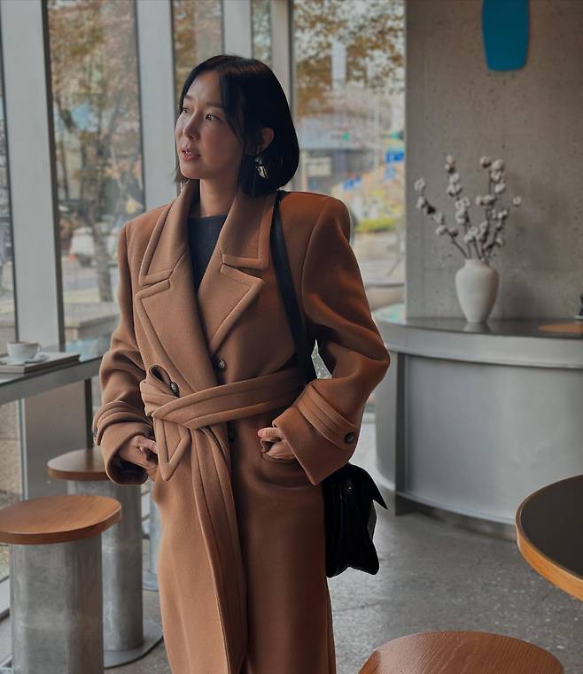 이지혜는 브라운 컬러의 롱코트를 착용해 클래식하면서도 따뜻한 분위기를 자아냈다. 더블 버튼 디테일과 허리 벨트는 코트의 실루엣을 살리며, 전체적으로 정돈된 느낌을 준다. 블랙 가방과 액세서리를 더해 고급스러운 겨울 패션을 완성했다.