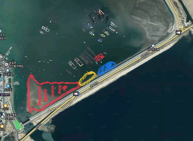 수문 앞 그리고 대호방조제 등으로